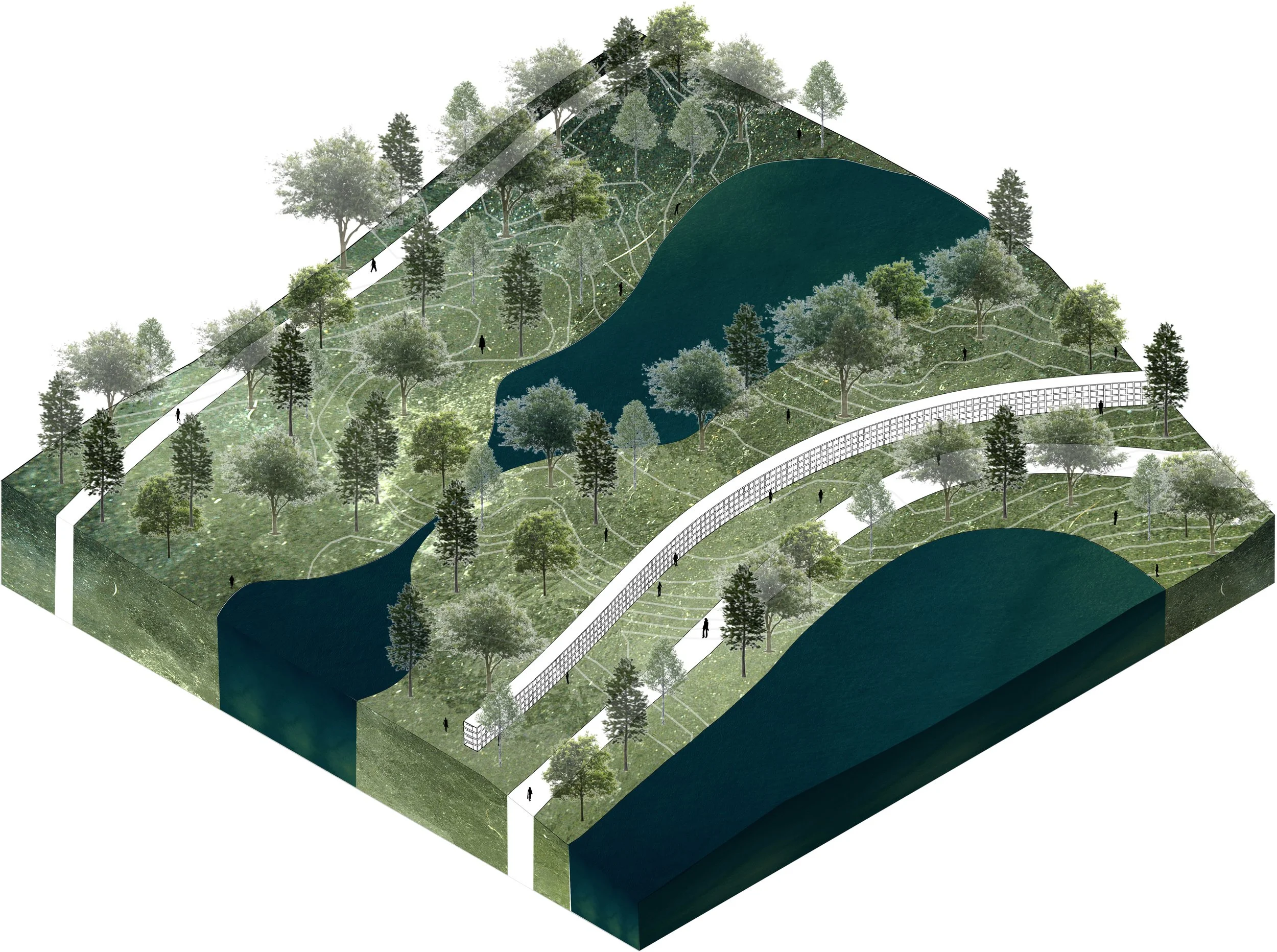 Placed in the center of an incredibly diverse and swiftly growing city, Enlace Tarango has the opportunity to reinvigorate the denizens of the city in a way previously unavailable to a large number of them. Breathing life into this currently dilapidated piece of land could revitalize the city, acting as a kidney that filters out the debris from surrounding lands and waters. Our design takes this theme to heart, the paths stretching out as though they were ar teries in a body to reach and positively impact the surrounding neighborhoods. With ponds and wetlands stretching across, our site collects and filters out water so that it can be repurposed elsewhere. The terrain is mainly driven by the winding waterways that cascade down the slope, and the arterial paths that connect to the outside neighborhoods. From there, zones were picked based on the opportunities the topography and geographical assets the land provided. From a wetlands ripe for swimming and play to a botanical garden with a diverse palette of plants, there’s something here for everybody.